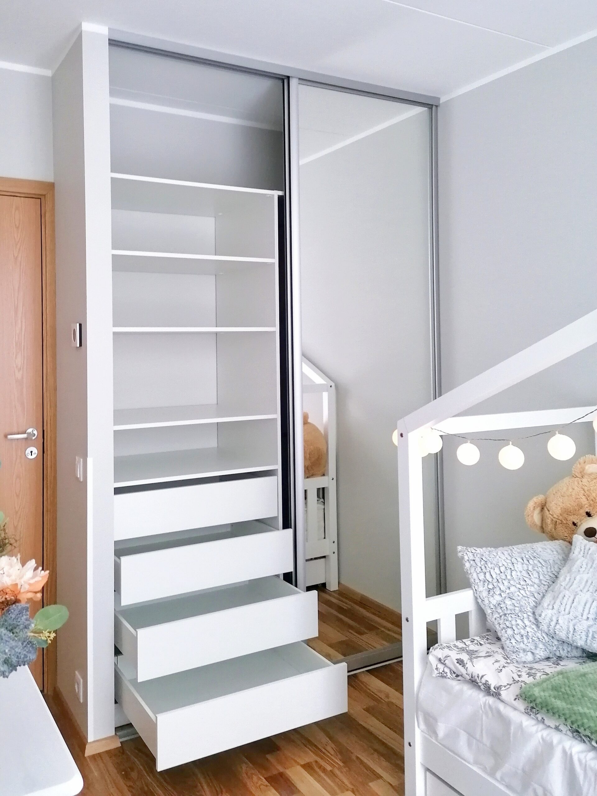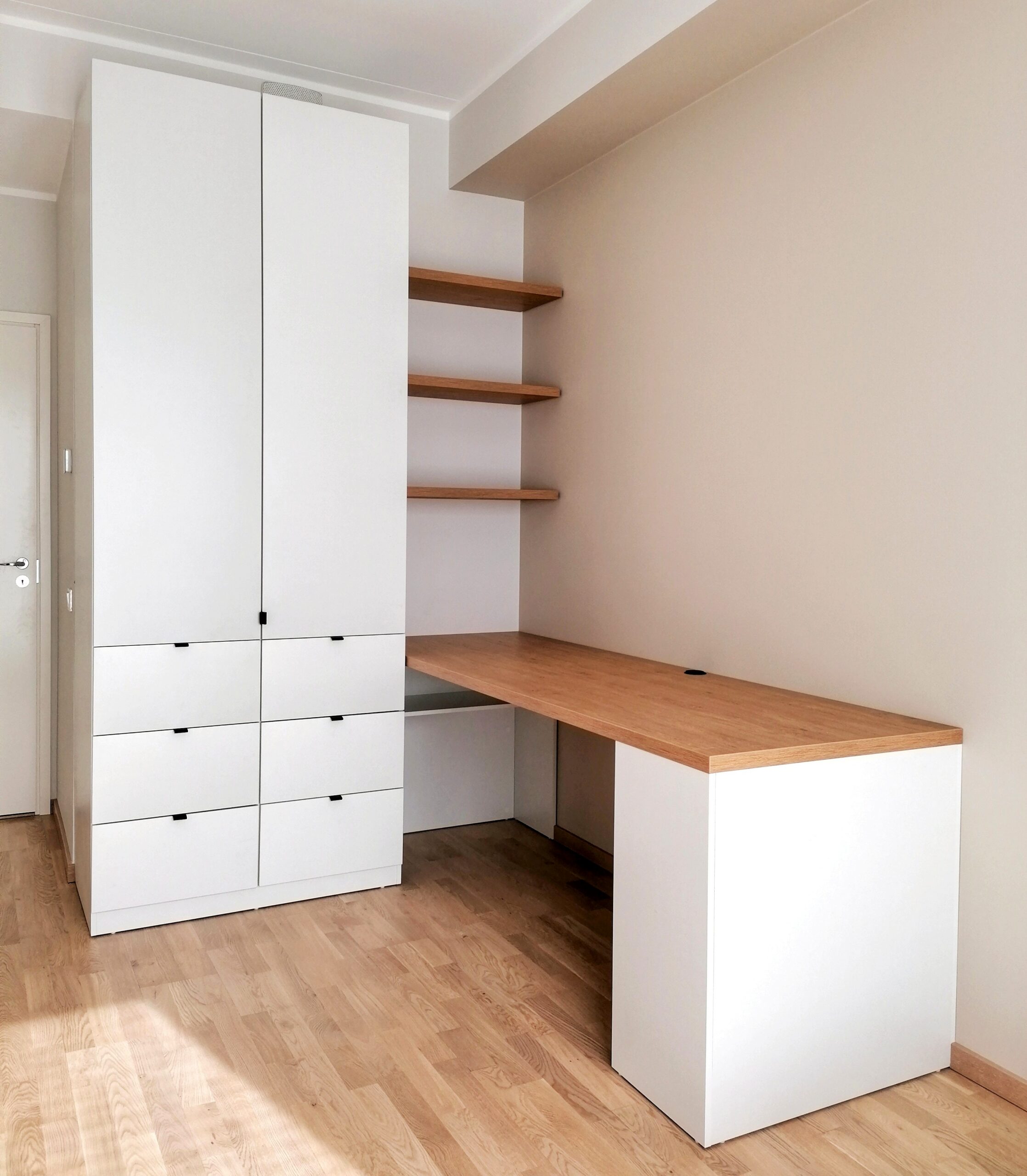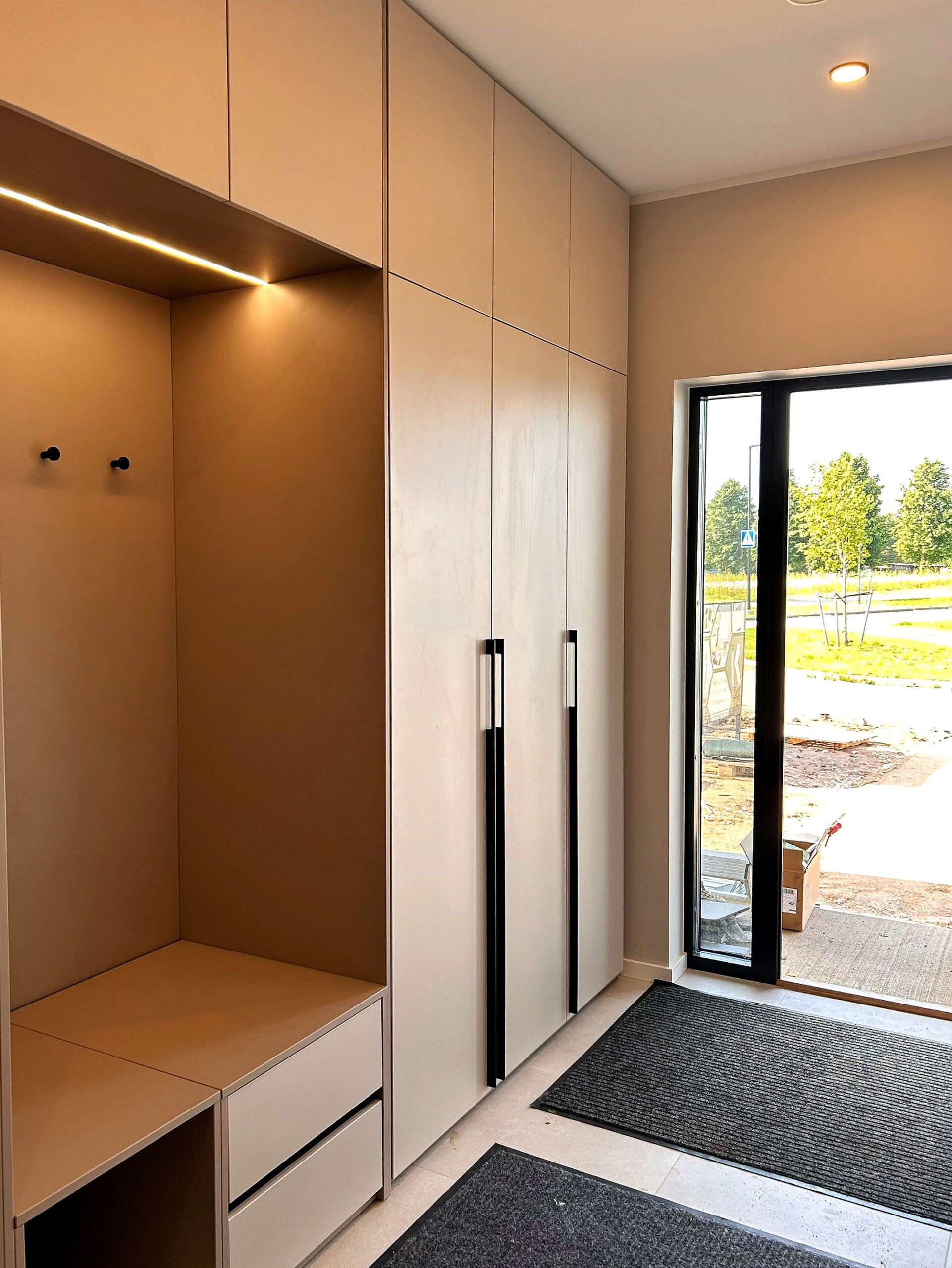 Väga ilus ja korralik töö, isegi vaatamata sellele, et tubade seinad olid veidi kõverad ja garderoobide paigaldamine nõudis mitmeid väljakutseid ja sobitamist. Ka materjalid on kenad ja lõpptulemus ilus ja esteetiline, praktilisusest rääkimata.