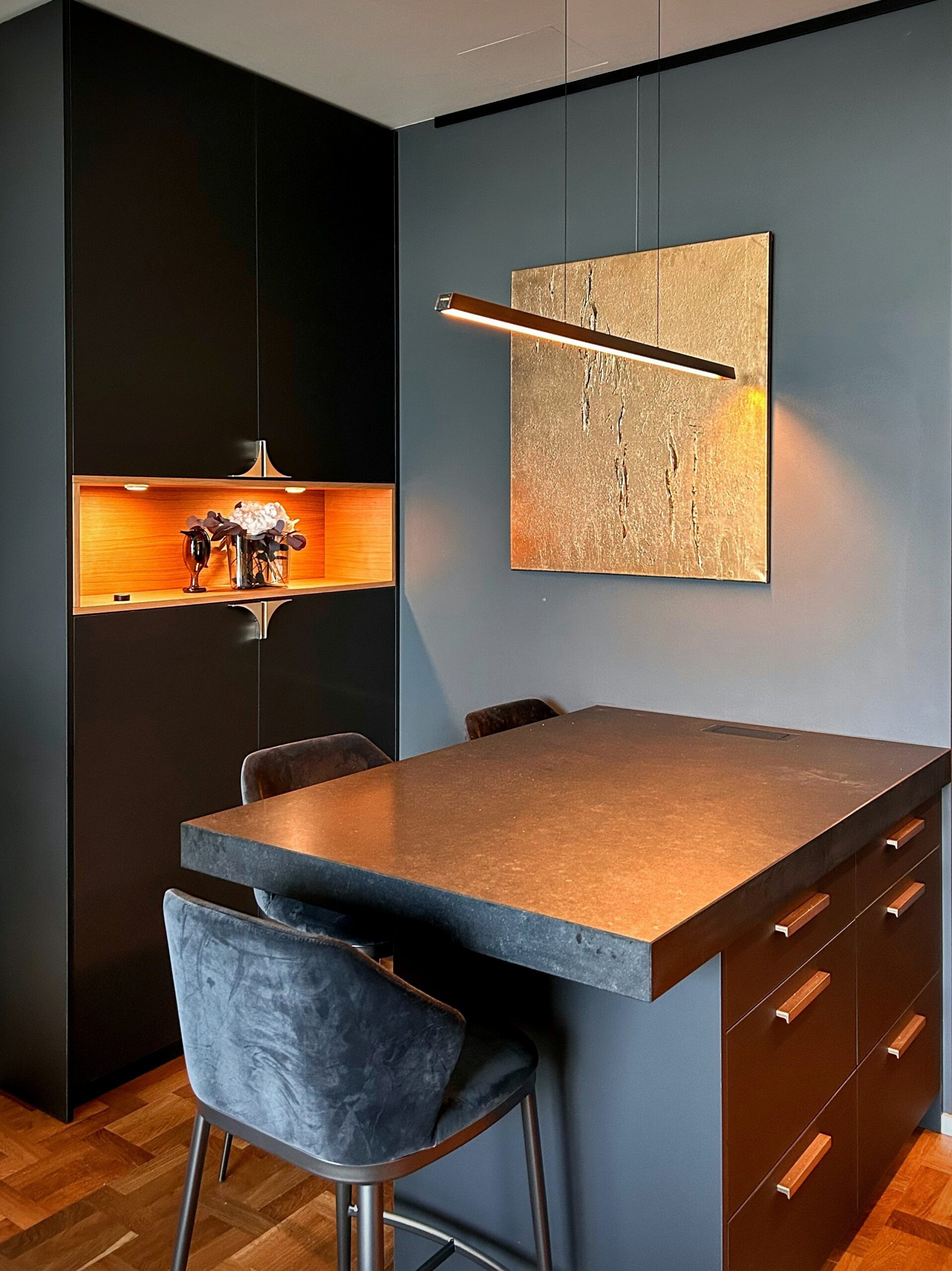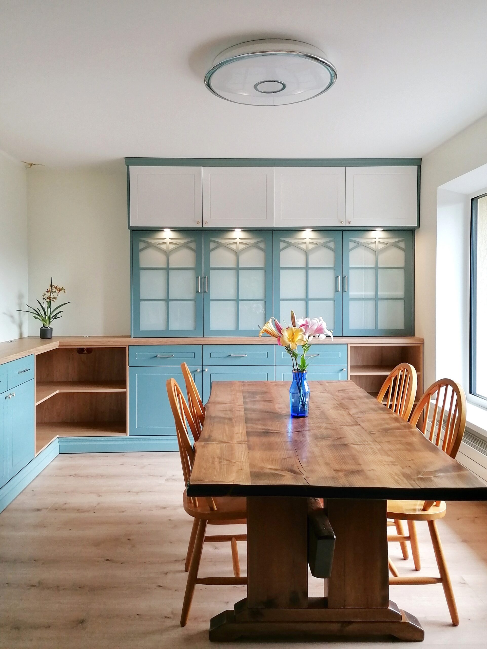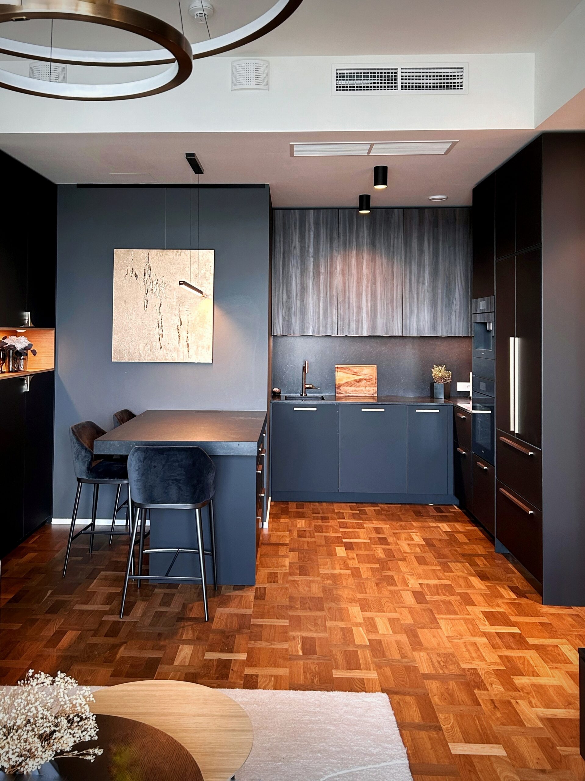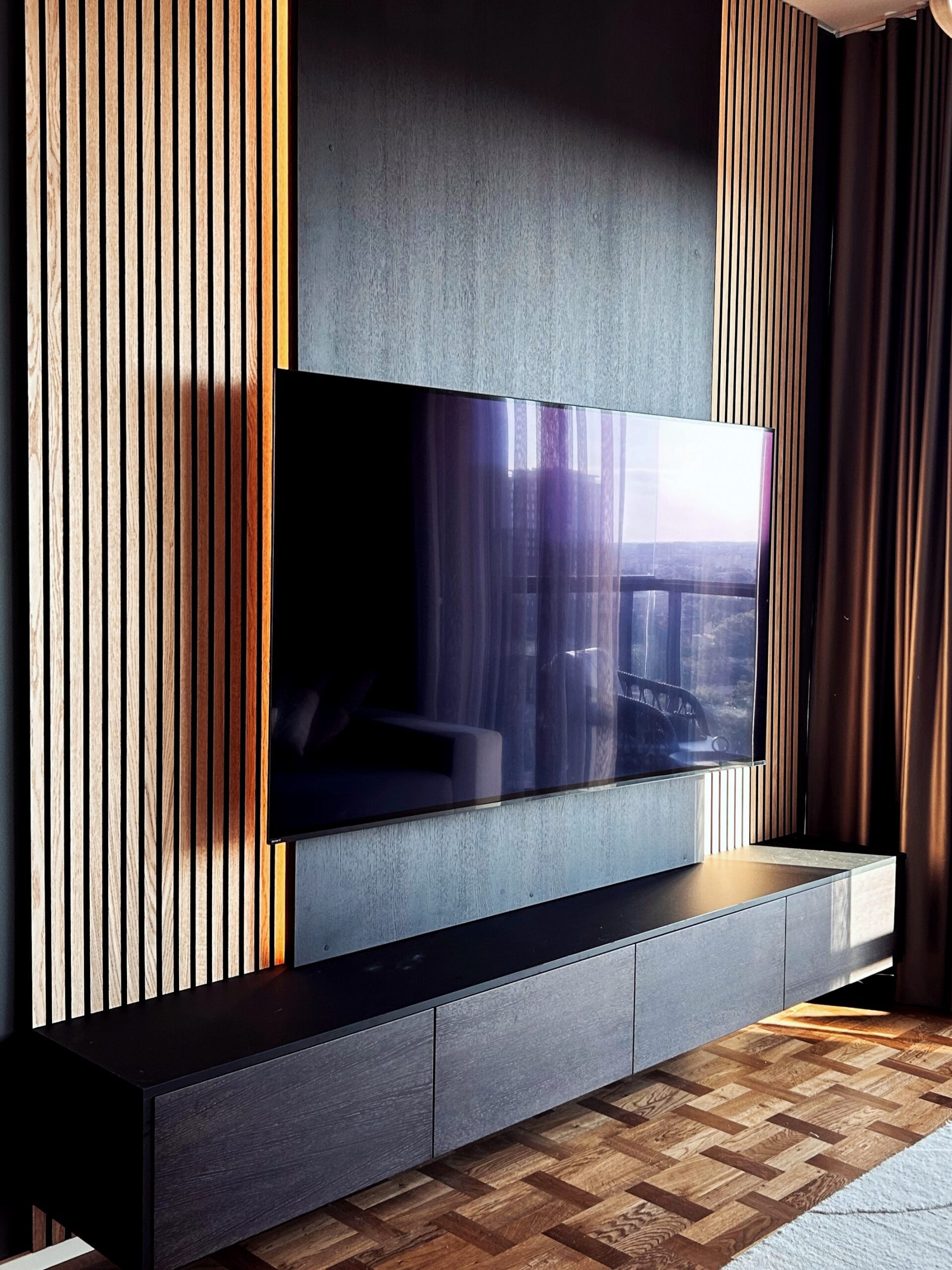 AM Sisustuse abiga valmisid köök koos saarega, vitriinkapp, telekalaud koos -seinaga, vannituba, magamistoa voodi koos kappidega ja esiku- ning magamistoa garderoobid.